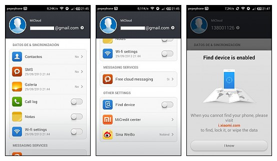 Nos aparece nuestra flamante nueva cuenta MiCloud, donde podremos elegir lo que queremos mantener sincronizado y lo que no, si aguardamos un momento y tenemos la conexión de datos activa, nos saldrá un último cartelaco que reza "Find device is enabled", vamos, que tenemos activo el servicio "ENCUENTRA TU TERMINAL" que viene a ser lo mismo que ha activado Google en nuestra cuenta Google Play para ver donde se encuentra nuestro movil, tableta o todo aquello que hallamos activado con cuenta google y posea conexión de datos.